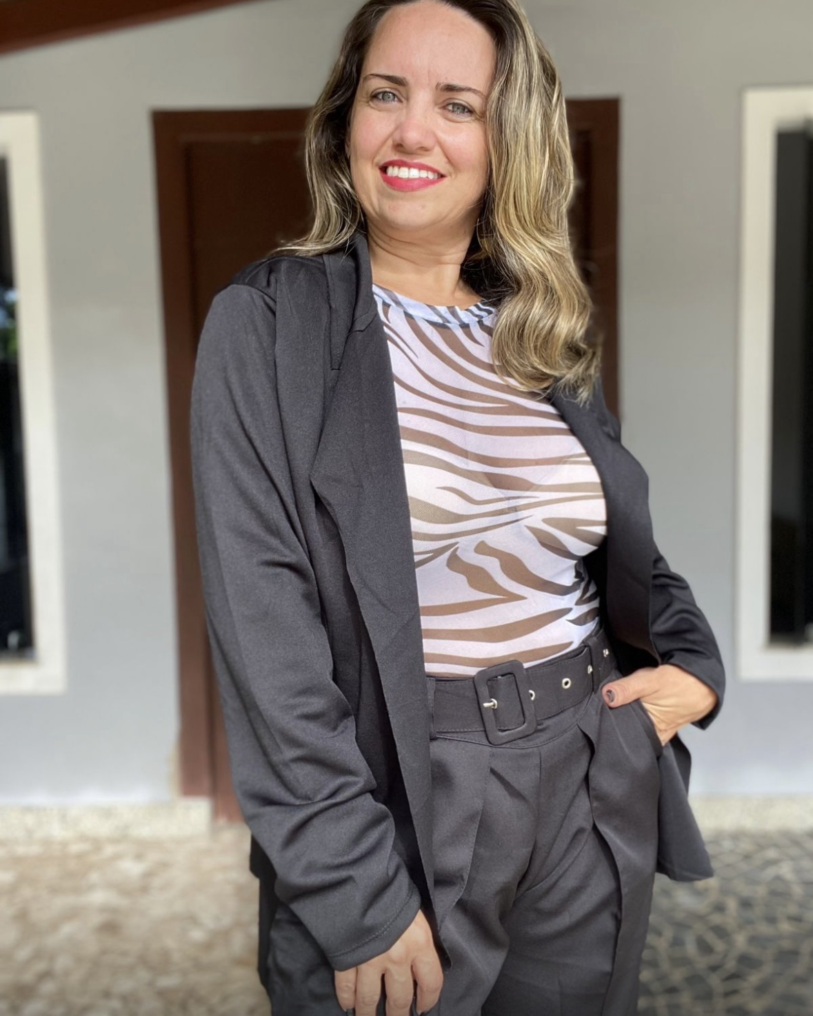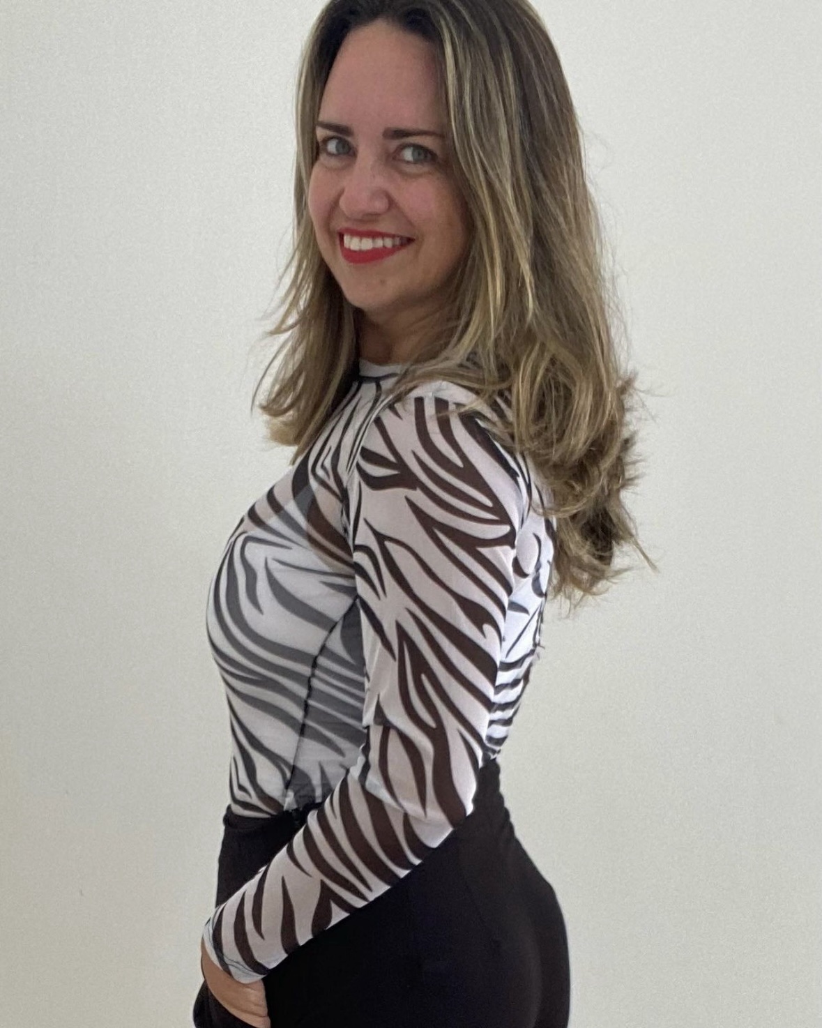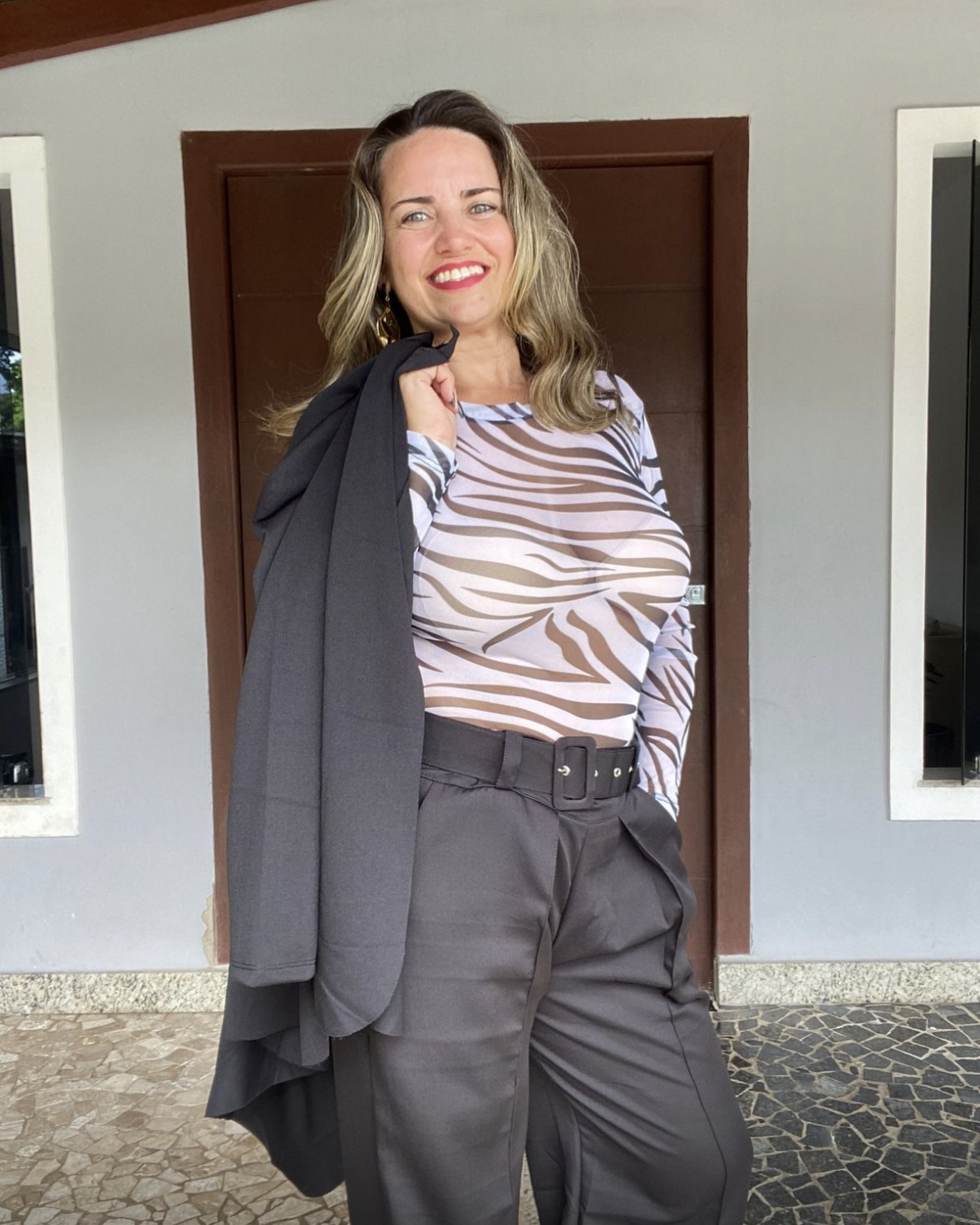 Blusa A blusa de manga longa, justa ao corpo e possui uma estampa de listras de zebra em preto e branco. O tecido é transparente podendo usar um top por baixo. Animal print.