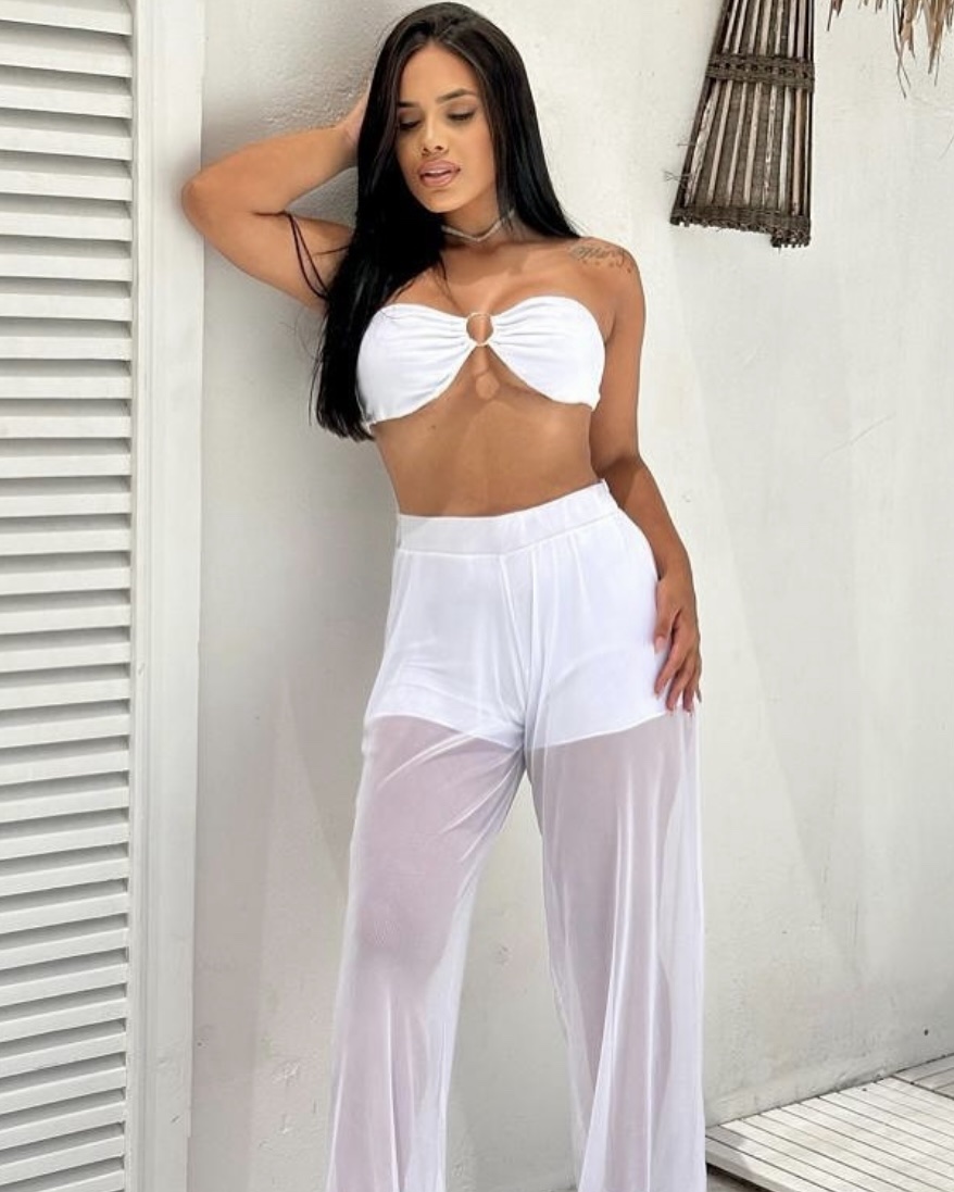 Conjunto branco com o Top tomara que caia e uma saia de tule junto com o short.